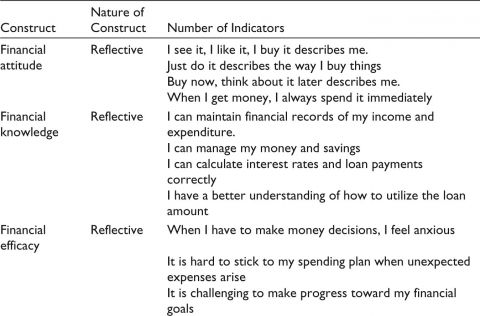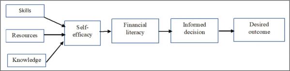 This study operationalizes the self-efficacy of the individual borrower to transform financial education into financial literacy. Mandell and Klein (2007) argue that motivation plays a significant role in transforming financial education or knowledge into financial behavior. Lewin (1938) in his theory has furthered the perspective on motivation. Vroom (1964) explains the underlying motivations behind human behavior in instrumentality, expectancy, and valence or utility. This theory, through the instrumentality, defines the difference in performance or outcomes and through instrumentality or valence, that is, through reward and utility. Burnet (1965) in his book argues that financial literacy is not simply knowing about financial concepts but also includes other personal and psychological dispositions, including achievement orientation, making choices, and pursuing leisure pursuits, to name a few. Repository propagates that individual makes sense of information using skills and technology, resources, and contextual knowledge to make informed decisions (Malhotra & Baag, 2021).