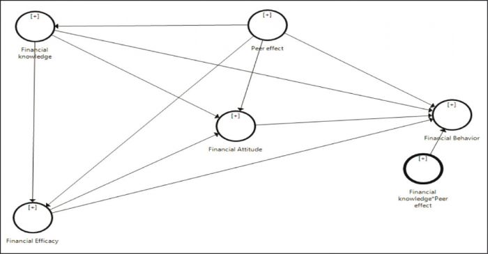 In this study, we propose “peer influence” as a moderator to test the moderating effect. We argue that “peer influence” will moderate all the hypothesized relationships so that the impact of financial knowledge would be greater in the presence of peer influence. To illustrate the different approaches for generating the interaction data and data treatment, we draw on a simple mediation model of financial knowledge impacting financial behavior through financial attitude (Angela et al., 2009; Mpaata et al., 2010; Nano, 2015; Potrich et al., 2016; Xiao et al., 2010). Drawing on the literature, we consider the peer effect as a moderator variable that impacts the relationship between financial knowledge and financial behavior. The results of the moderation analysis are given in Figure 5.