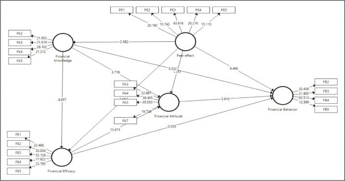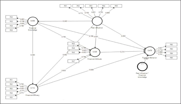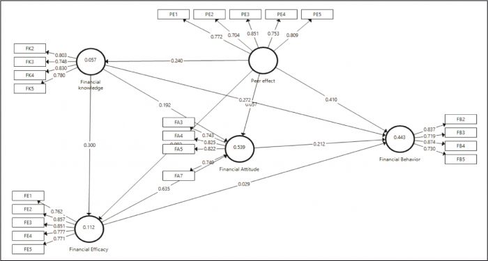 Note: FK: Financial knowledge, FE: Financial efficacy, FA: Financial attitude, FB: Financial behavior, PE: Peer effect.