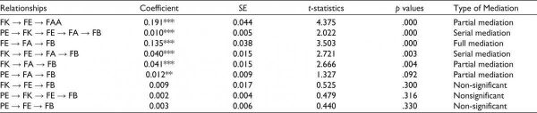 In this model, the mediating effect of financial efficacy between financial knowledge and financial attitude (H15: Financial knowledge – Financial efficacy – Financial attitude) is significant; (β1 = 0.191; t = 4.375; p < .000). The mediating effect of financial efficacy between the peer effect and financial behavior is insignificant (H14: Peer effect – Financial efficacy – Financial behavior), (2 = 0.003; t = 0.440; p > .330). The mediating effect of financial efficacy between financial knowledge and financial behavior is insignificant; (H13: Financial knowledge – Financial efficacy – Financial behavior) (β3 = 0.009; t = 0.525; p < .300). The mediating effect of financial attitude between financial knowledge and financial behavior is significant (H4: Financial knowledge – Financial attitude – Financial behavior) (β5 = 0.041; t = 2.666; p < .004). The mediation analysis result indicates a partial complementary mediation (abc, “the product of the indirect effect ab and the direct effect c,” is positive (Zhao et al., 2010). However, the impact of financial attitude between peer effect and financial behavior is non-significant (H5: Peer effect – Financial attitude – Financial behavior) (β6 = 0.012; t = 1.327; p < .092) is non-significant (Menon et al., 2021; Nitzl et al., 2016; Rasoolimanesh et al., 2021; Zhao et al., 2010). The mediating effect of financial attitude between financial efficacy and financial behavior is significant (H16: Financial efficacy – Financial attitude – Financial behavior) (β7 = 0.135; t = 3.503; p < .000). Also, the mediating effect of financial attitude between financial efficacy and financial behavior is full mediation as the indirect effect is significant and the direct effect of financial efficacy on financial behavior is not significant. The serial mediation between financial knowledge and financial behavior through financial attitude and financial efficacy is significant (β = 0.041; t = 2.666; p < .003). And the serial mediation effect between the peer effect on financial behavior through financial attitude, financial efficacy, and financial knowledge is significant given (β7 = 0.010; t = 2.022; p = .000). Also, the serial mediation effect between peer effect on financial behavior through financial knowledge and financial efficacy is insignificant (β8 = 0.002; t = 0.479; p = .316).