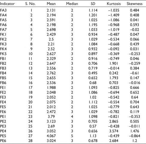 The lack of a normal distribution is the primary reason for using the PLS-SEM model (Hair et al., 2012). However, this is not sufficient justification. The non-normal data assumption can impact the PLS-SEM results in some instances. The confidence intervals for skewness are managed through bias-corrected, corrected, and accelerated (BCa) bootstrapping. We used the univariate and multivariate analyses of the skewness and kurtosis to evaluate the distributional assumptions. These results are given in the Appendix of the study. Most of the Kurtosis and Skewness in the univariate analysis are between +/–2 (George & Mallery, 2010; Mardia, 1970). The presence of outliers was determined using online software (Zhang & Yuan, 2018) to determine the multivariate normality of the data using the Mardia test. The skewness and kurtosis obtained from the Mardia web power platform suggested that the data were multivariate non-normal. Mardia’s multivariate skewness (β = 4.23, p < .001) and Mardia’s multivariate kurtosis is (β = 46.88, p < .001). Thus, multivariate kurtosis and skewness are way beyond the threshold limit, that is, the measure of skewness >+/–1 and skewness >+/–20, and data are non-normal. Nonnormality in the data is the main reason for using the PLS-SEM for analysis (Hair et al., 2019; Mardia, 1970; Zhang & Yuan, 2018). The full collinearity test suggested by Kock (2015) (as mentioned in Table 3 that VIF values ranging from 1.070 to 2.68 for all the latent constructs below the threshold limit of 3.3 suggest that Common Method Bias (CMB) is not the problem for the current study. The results of VIF are given in Table 3.