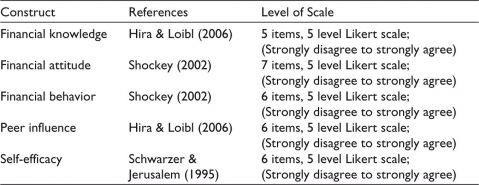 Previous researchers who have studied financial literacy (Hilgert & Hogarth, 2003; Lusardi & Mitchell, 2011; Mandell, 2008; OECD, 2013) have used the questionnaire survey as the tool for the collection of data. The scales have been adopted from the extant literature and modified for study. Table 1 provides a prototype or copy of the questionnaire. The items in the questionnaire were randomized with multiple sets to prevent bias in data collection. The following sources, as mentioned in Table 2, have been used for obtaining the scales for measuring the relevant constructs scales for measuring the relevant constructs.