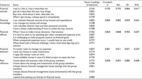 This experiment was analyzed using SmartPLS software. Since this is an experimental study, we have used the Partial Least Squares Structural Equational Modelling (Hair et al., 2011; Hair et al., 2017; Hair et al., 2019; Sharma et al., 2021). A two-step procedure was used to analyze the study’s conceptual framework: The first stage of the study validated the quality of the scale using the measurement model. The hypothesis was tested using the non-parametric bootstrapping technique in the second stage (Wetzels, 2009). Our model includes one-dimensional structures (i.e., financial attitude, financial knowledge, financial efficacy, peer control, and financial behavior). There were reflective indicators (Jarvis et al., 2003) for financial knowledge, financial attitude, financial efficacy, peer control, and financial behavior. As a result, this study presents a composite measurement model with a reflecting design (Henseler, 2018). We constructed a measuring model based on the buildings (Henseler, 2017). Financial attitude and efficacy were negatively worded and transformed accordingly using SPSS. The output showed that the six factors with an eigenvalue greater than 1, with the first factor explaining approximately 29.45% of the total variance, which is way below the 50% threshold, and thus there is no threat of Common Method Variance (CMV) in the study.