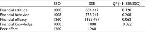 There is a (Financial knowledge – Financial behavior) significant and positive influence of financial knowledge on behavior supporting H3 (β4 = 0.272, p < .000, t = 5.434). The relationship between financial knowledge and financial efficacy is significant; (H12 Financial knowledge – Financial efficacy) (β5 = 0.30; p < .000, t = 4.844). Finally, there is no significant relationship between peer effect and financial attitude (H6 Peer effect – Financial attitude) rejecting the (β7 = 0.057, p > .000, t = 1.38). Peer effect positively impacts financial behavior (H7 Peer effect – Financial behavior) (β6 = 0.410, p < .000, t = 9.572), and the impact is significant. Peer effect has no significant impact on financial efficacy (H8 Peer effect – Financial efficacy) at a 5% level of significance (β7 = 0.092, p < .000, t = 1.638), and peer effect has a significant impact on financial knowledge (H9: Peer effect – Financial knowledge) (β9 = 0.240, p < .000, t = 3.529). We used the size of f 2 to quantify the significant effects. The f 2 values are above the cut-off value of 0.02 for all construct relationships except between financial efficacy and financial behavior and peer effect and financial attitude and peer effect and financial efficacy. Specifically, there is a medium effect (values between 0.15 and 0.35) between peer effect and financial behavior. And there is a large effect between financial efficacy and financial attitude. And there is a less-than-average effect between financial efficacy and financial behavior and between peer effect and financial attitude and peer effect and financial efficacy. We also assessed the model by examining the dependent variables’ cross-validated redundancy index (Q2). Values above 0 suggest that the model shows predictive relevance (Hair et al., 2017). The results of Q square predict are given in Table 7.