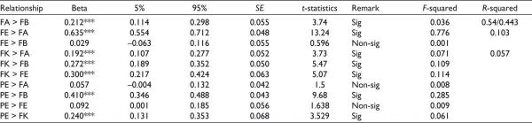 We used the proportion of variance explained to assess the accuracy of the model’s prediction. The results show R2 for the dependent variable. According to the blindfolding process used in the PLS, the stone Neisser Q2 value was used to examine the predictive relevance (Chin, 2010; Hair et al., 2009). Multicollinearity was measured using the Variance Information Factor, and all values were less than the recommended benchmark of 3.33 (Hair et al., 2019). From the model analysis, it becomes apparent that the model has no multicollinearity issue. The R2 value represents and explains the variance of the dependent concept. The model explains 54% of the variance in the financial attitude of a model and 44.3% of the variance in the financial behavior. The model explains 11.2% of the variance in financial efficacy. However, the R2 for financial knowledge is low at 5.7%. R2 values are high to moderate (below 0.75), 0.540 for financial attitude, and 0.443 for financial behavior. It is moderate to low (below 0.5), 0.112 for financial efficacy, and 0.057 for financial knowledge (Hair et al., 2011; Hair et al., 2014; Shumeli, 2016). Thus, in our study, the variation explained is adequate for analysis.
